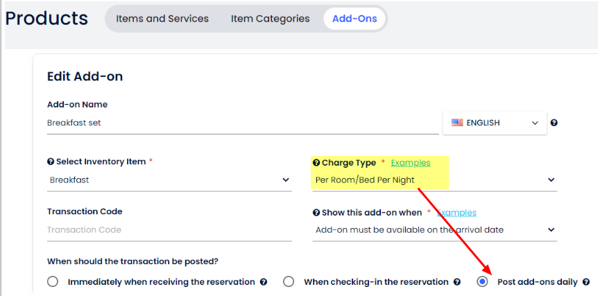If the add-ons charge type is selected as: Per Night, Per Guest Per Night or Per Room/Bed Per Night you can select for the transaction to be posted daily as shown below: