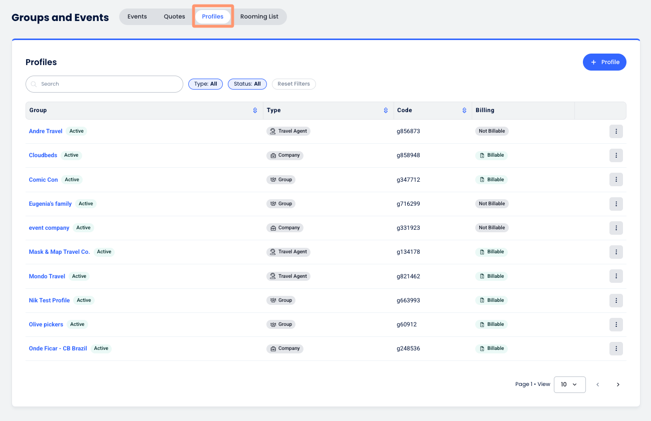 The Profiles tab is where you centrally store and manage detailed information for group entities, such as companies or travel agencies. By maintaining these profiles, you can apply consistent billing instructions and contact details across multiple separate events.