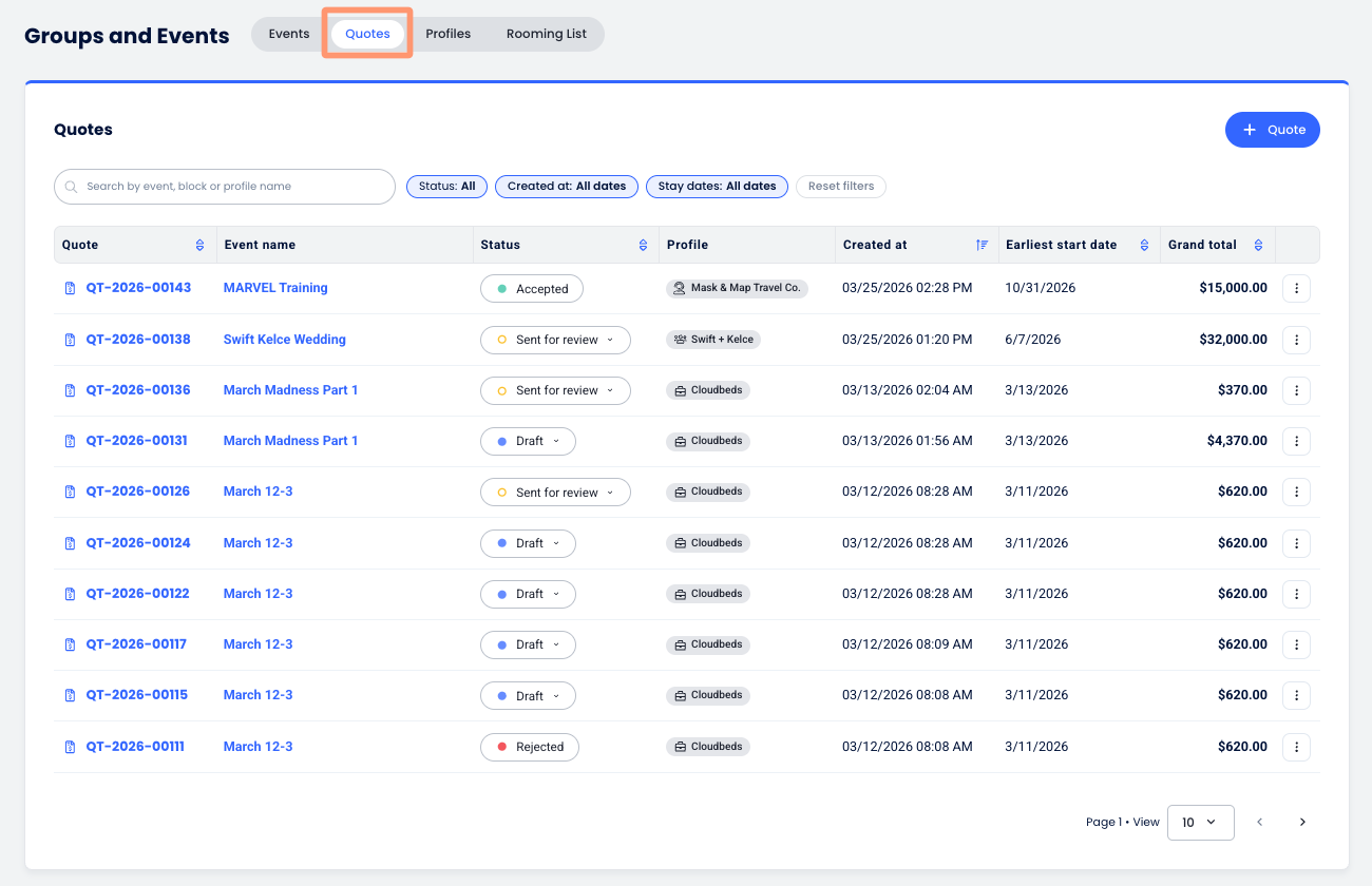 The Quotes tab allows you to draft and manage group proposals and pricing inquiries before they are converted into confirmed events. This helps sales teams track prospective business and send professional quotes to potential group organizers.