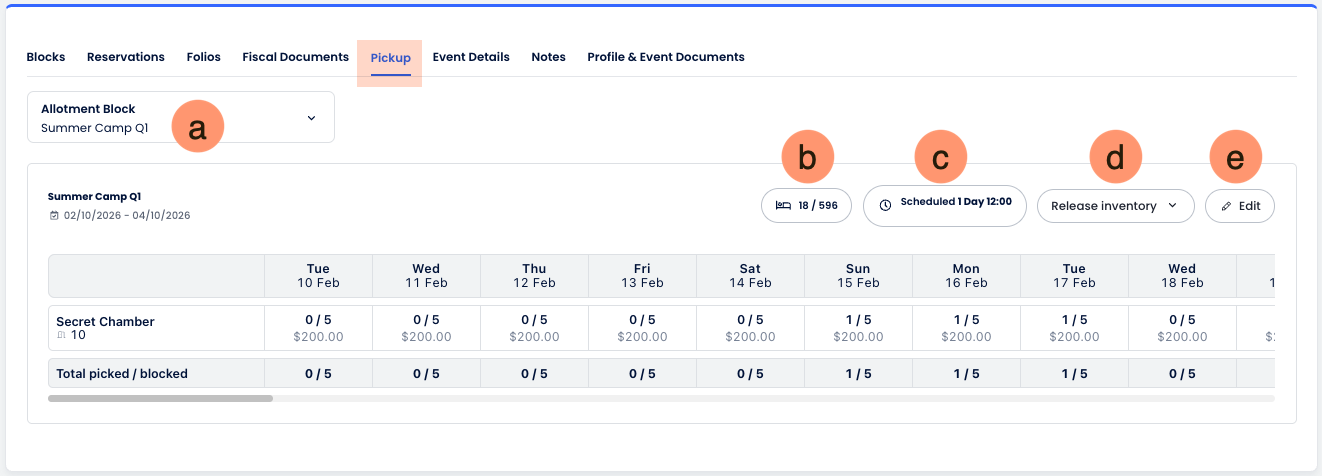 The Pickup tab provides a granular, real-time interface to monitor your inventory performance and track how effectively your allotted blocks are being utilized. This workspace allows you to compare your forecasted business against actual guest pickups on a day-by-day and room-type-by-room-type basis.