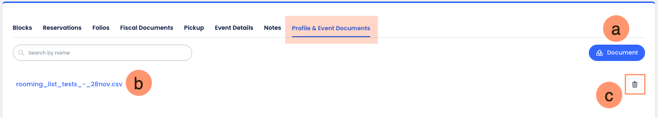 - Add documents: Use the Document button to upload files related to the event or the associated profile, such as contracts, agreements, BEOs, rate sheets, or supporting documentation.