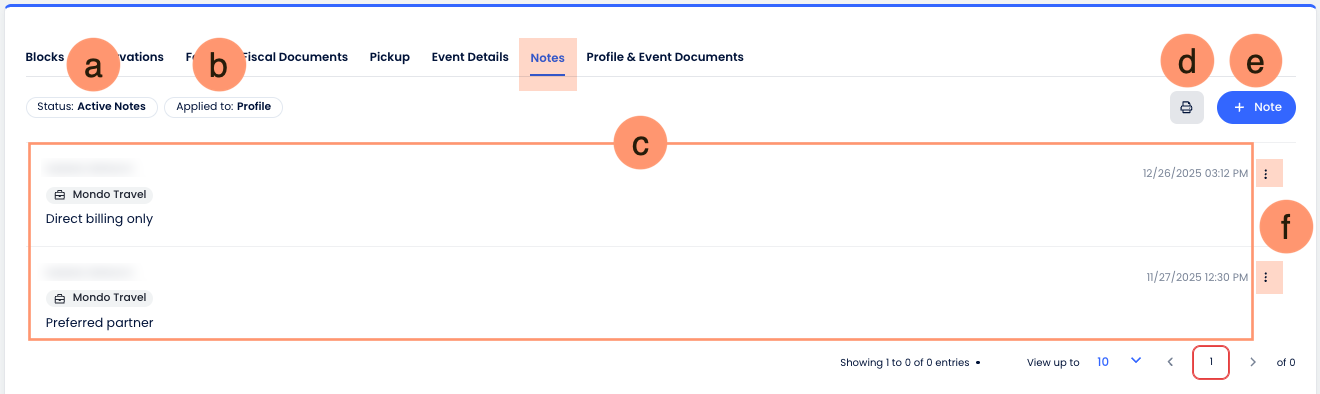 - Consolidated notes list: Displays notes created at different levels, including the Event, linked Profile, and individual Reservations or Guests. Each note clearly identifies its source and includes the note content for easy reference.