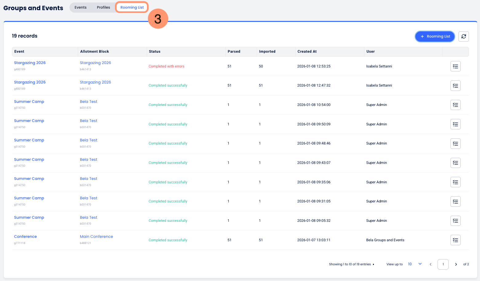 The Rooming List tab acts as a consolidated hub for all guest import activity. Instead of manually entering dozens of reservations, you can upload a spreadsheet to assign guests to existing allotment blocks.