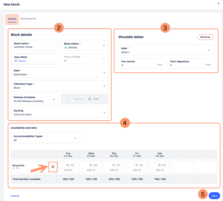 - Granular Inventory Grid: Click the arrow next to the block name to expand the day-by-day view. Here you can monitor performance by specific Accommodation Type and see the exact number of rooms blocked, picked up, and available for each specific date in the calendar grid.