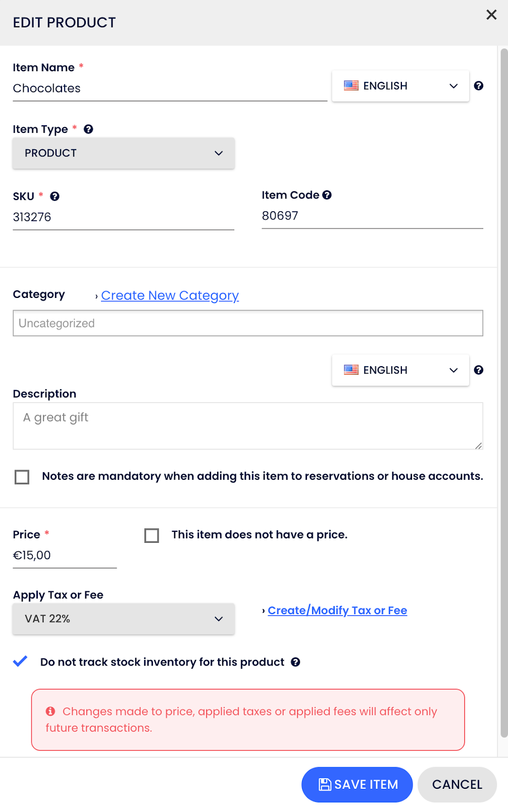 | Tax | Aliquota ordinaria 22% | Inclusive | VAT (IVA) | Items; Reservations | Percentage of total amount | 22% | No |