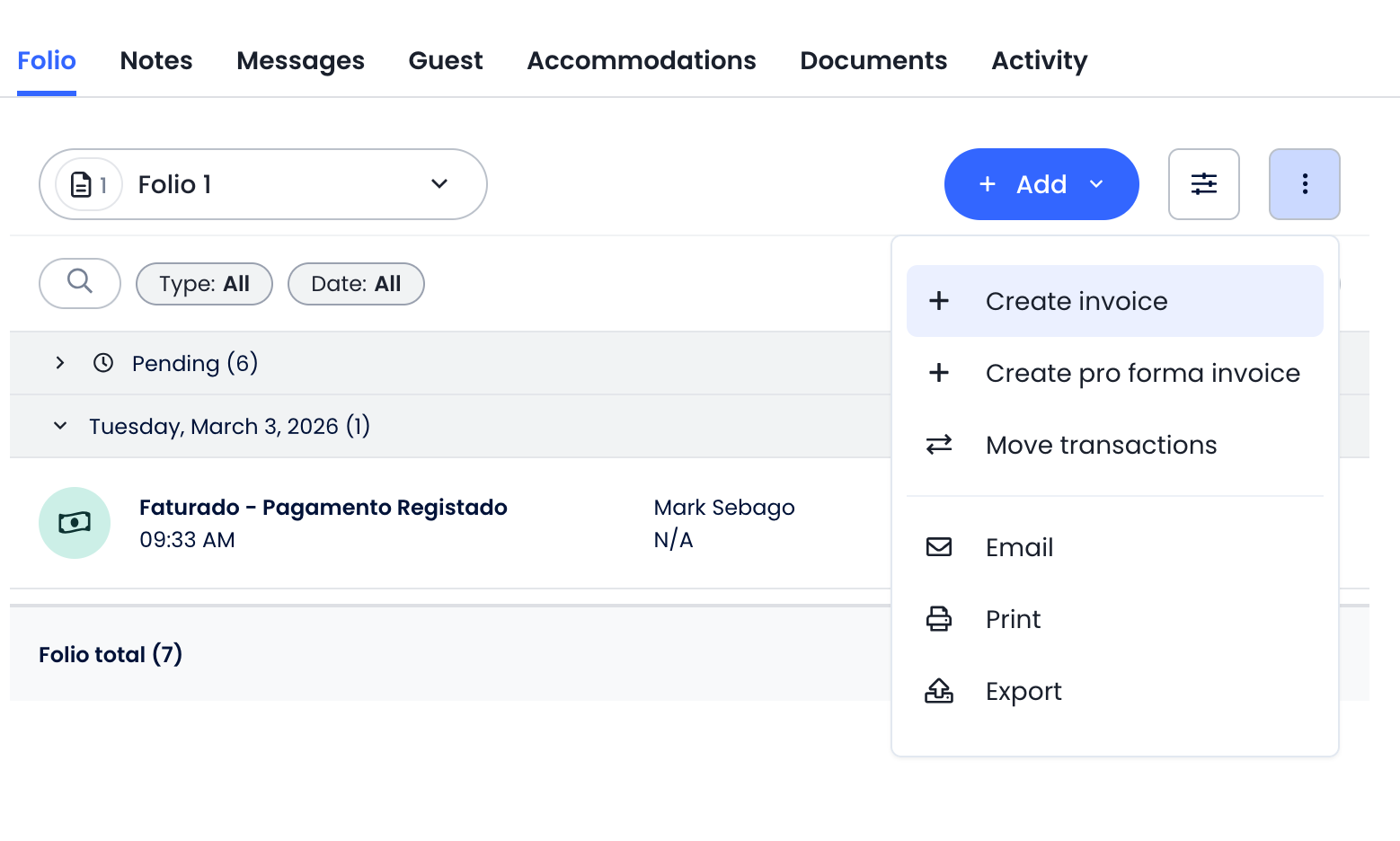 - Click Add Payment on the folio.