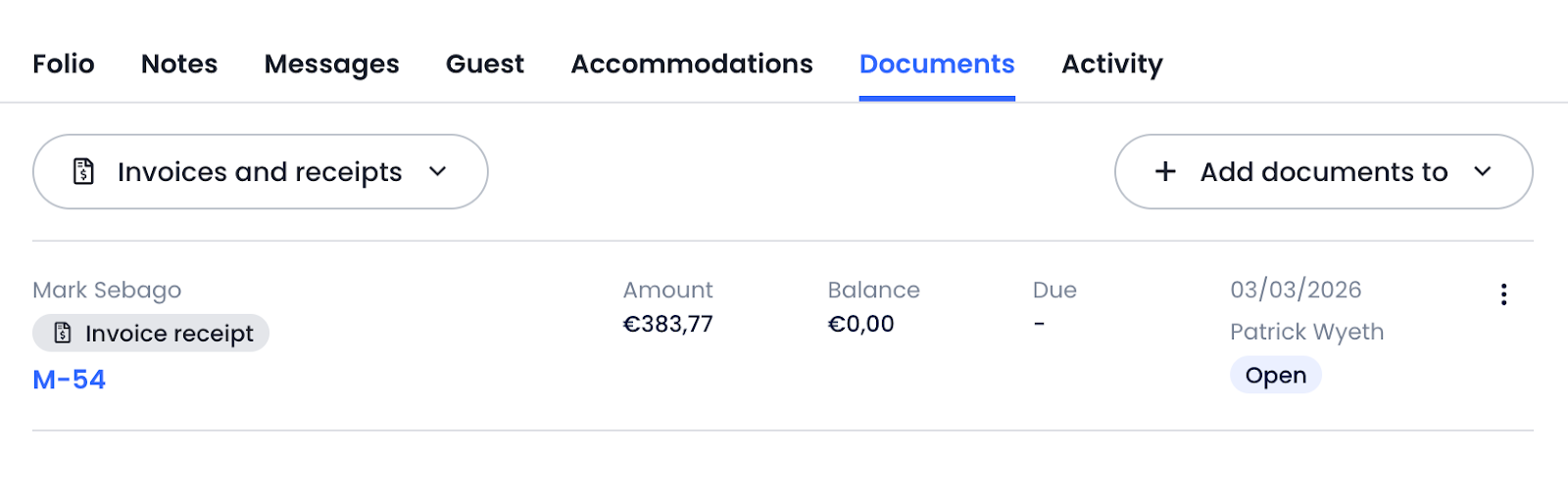 All generated documents can be found under the Documents tab of a reservation or house account.
