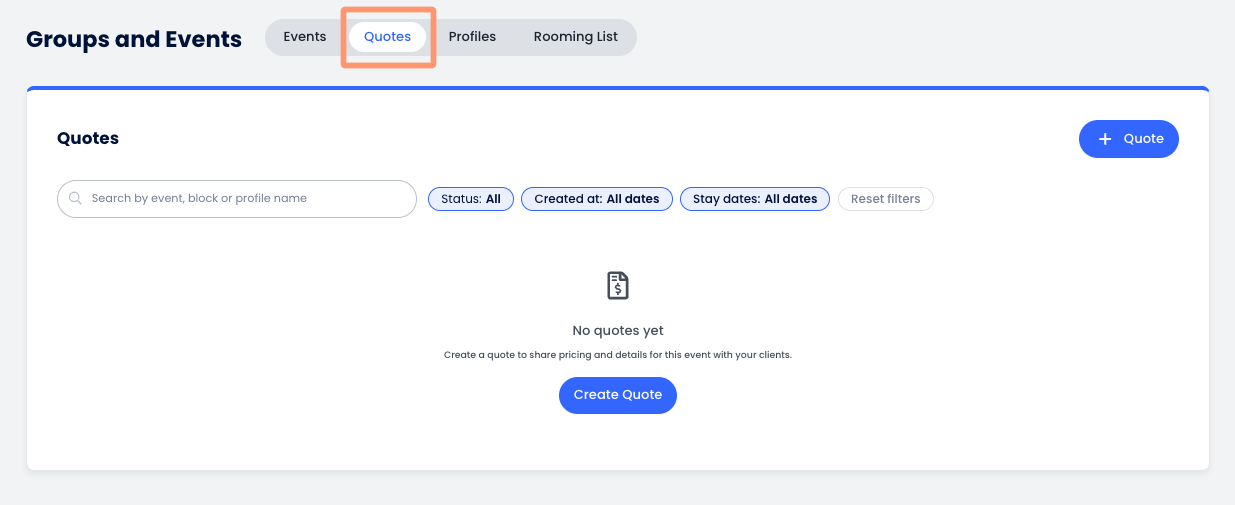 Global Quotes Tab: Navigate to the Quotes tab in the Groups & Events hub and click + Quote. This is best for seeing all quotes across different events in one place.