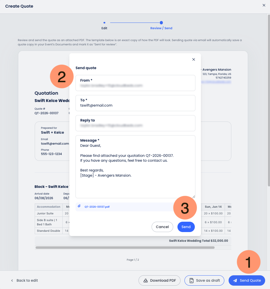 - Preview: Click Preview quote to review the branded document featuring your property logo and contact details.