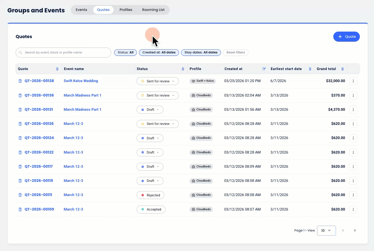 Currently, quotes are scoped exclusively to Groups and Events. This is because the pricing logic is sourced directly from definite allotment blocks. Quotes for individual or standard reservations outside of the Groups & Events module are not available at this time.