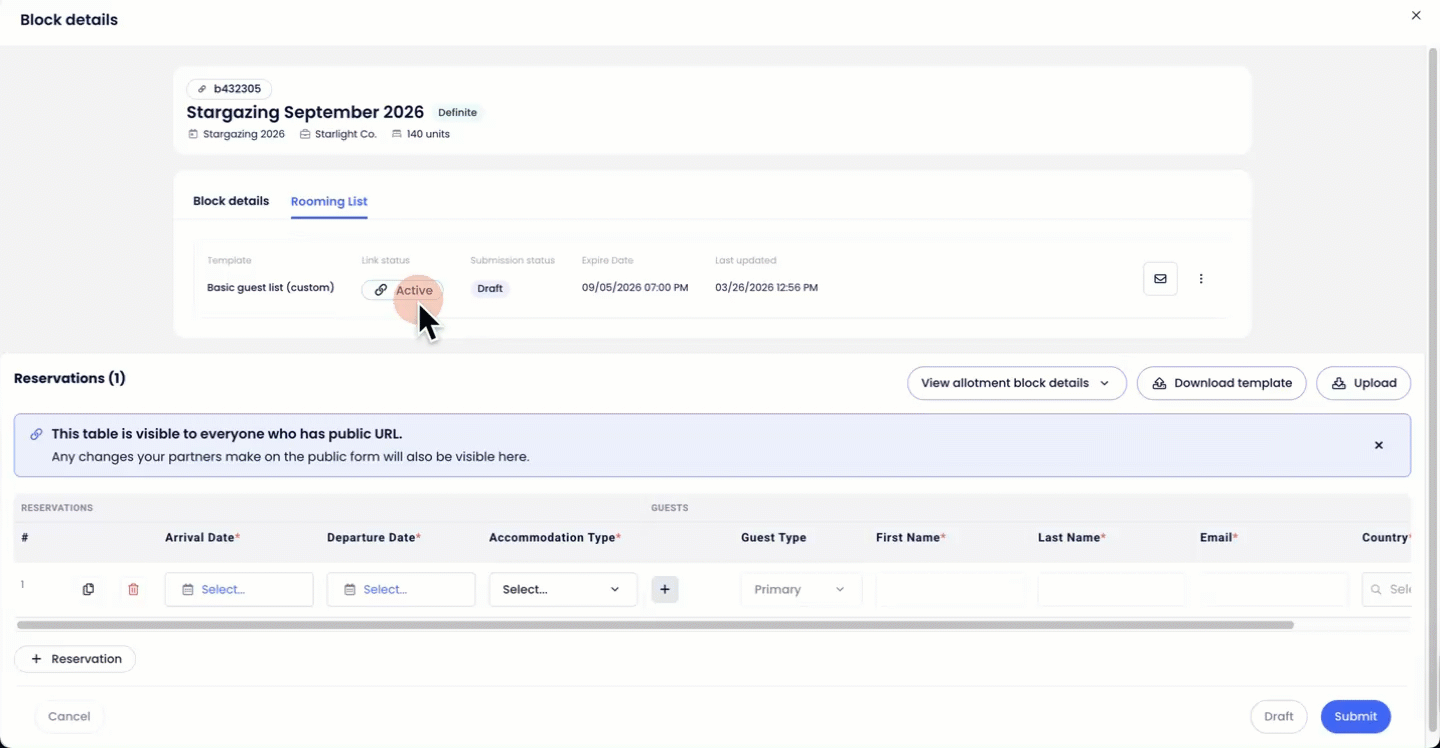 - Allotment Block & Global View: These entry points anchor the rooming list to a specific block as a persistent task. This allows you to save drafts, perform full-file validation, and use the Public Link for external coordination.