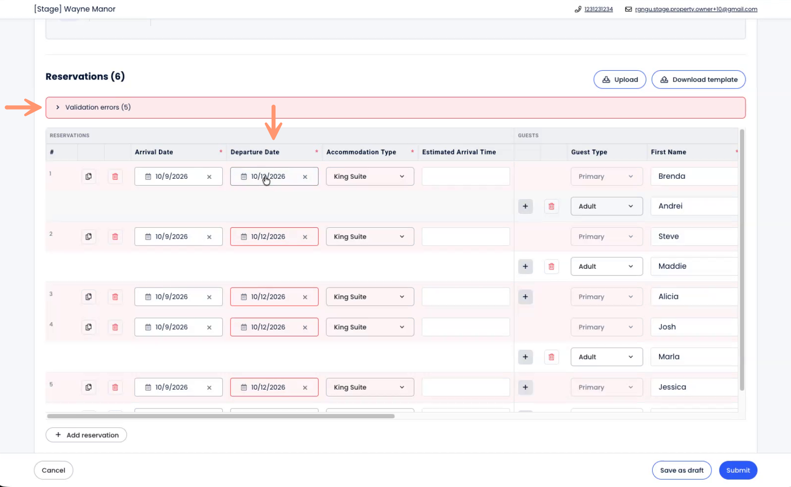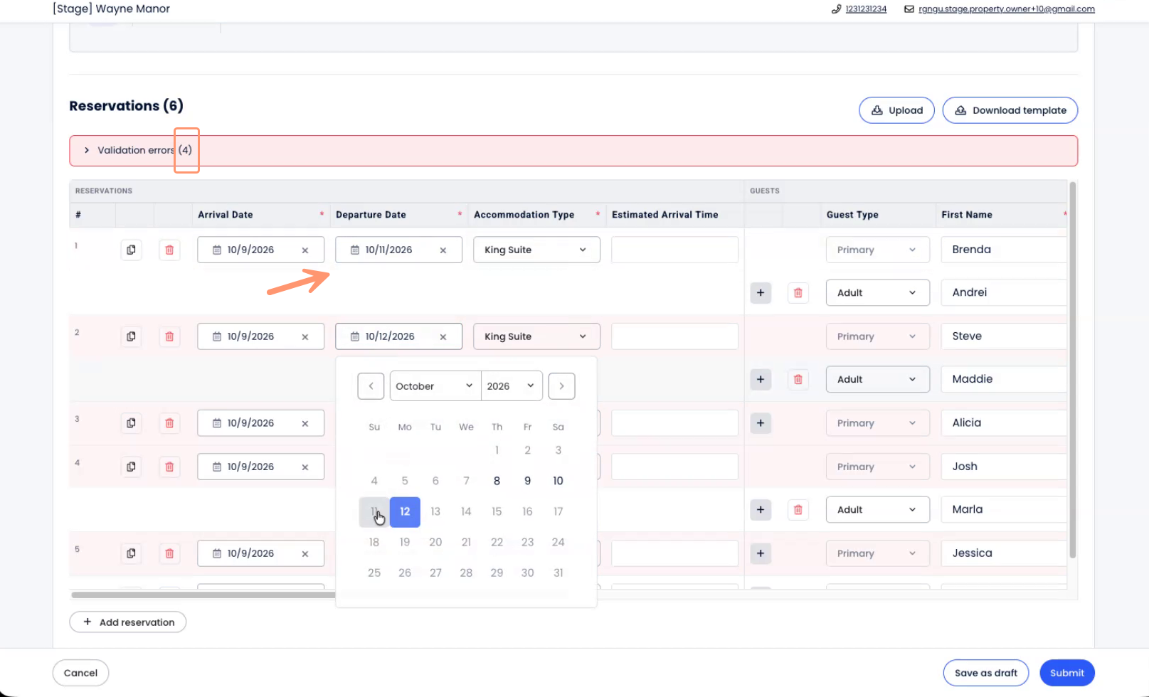 If your uploaded file contains data errors—such as invalid date formats, email addresses, or dates falling outside the block range—the system will display a Validation errors banner and block the import to ensure data integrity.