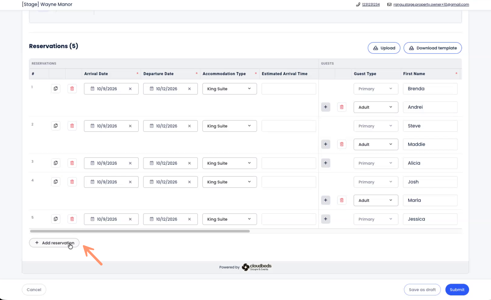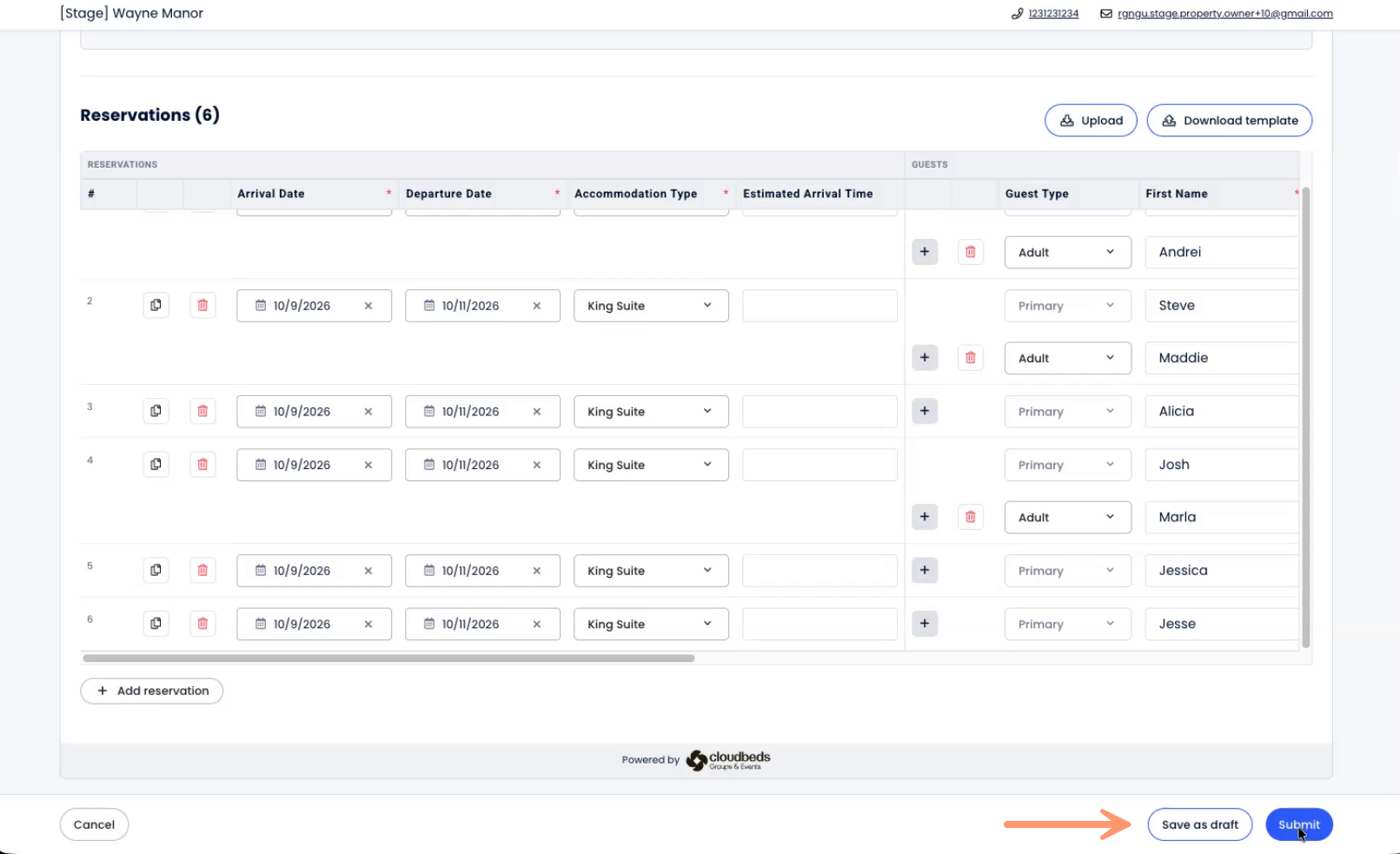- Submit: Use this when the list is finalized. Clicking Submit locks the list from further edits and triggers the creation of individual reservations in the Cloudbeds PMS.