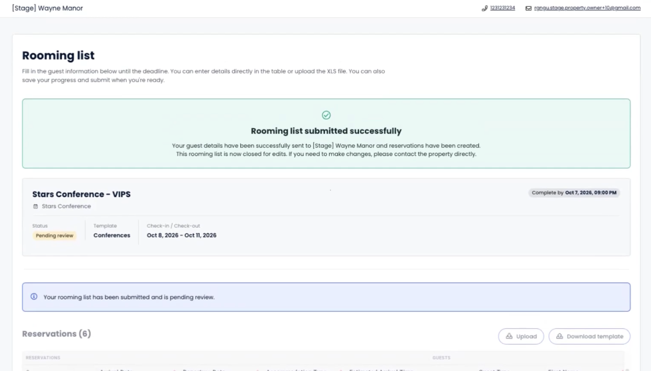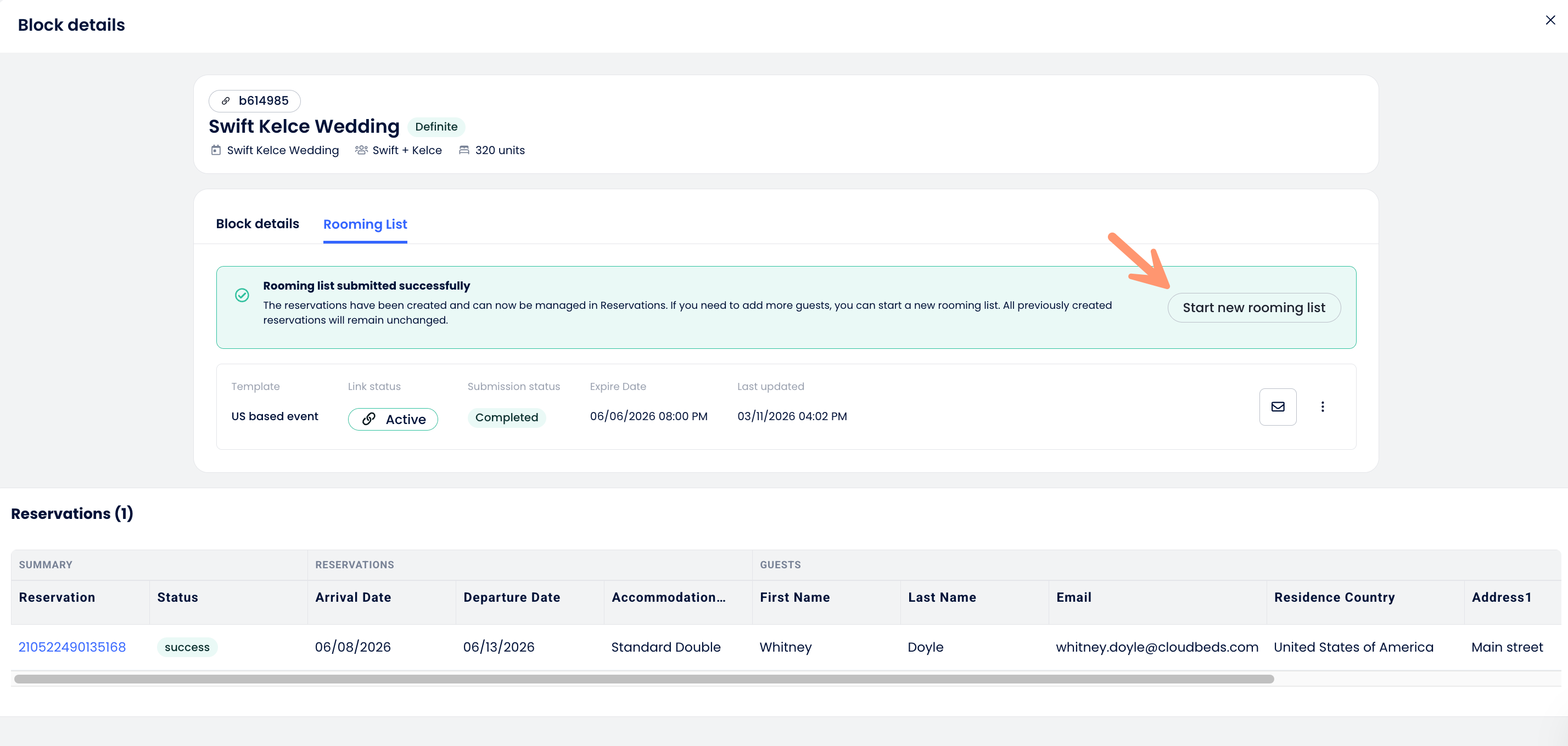 Once a list is submitted, the created reservations remain unchanged. However, if you still have available inventory in your allotment block, you can repeat the process by clicking Start new rooming list within the same block. This creates a fresh page for new entries while keeping your previous imports secure.