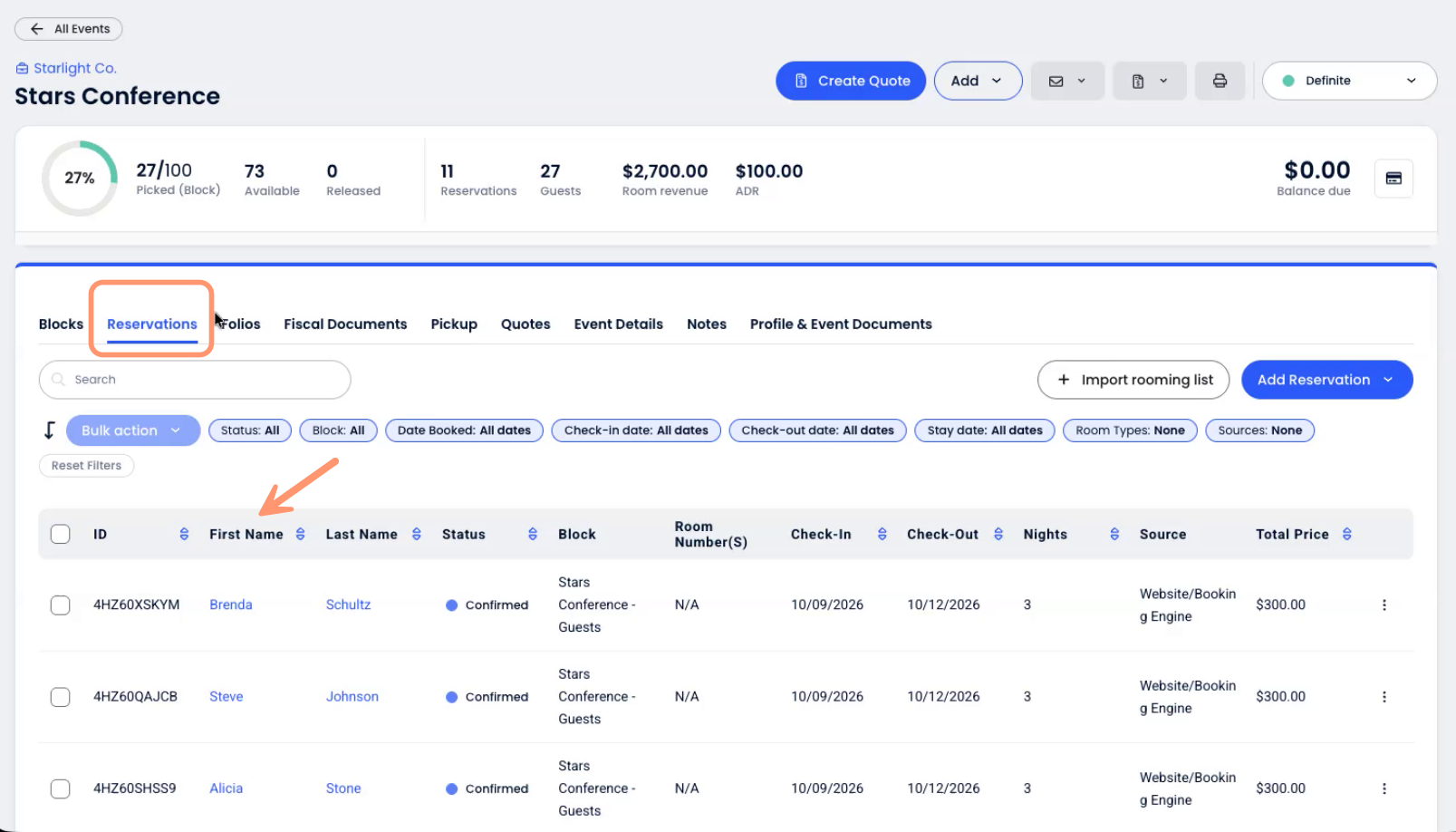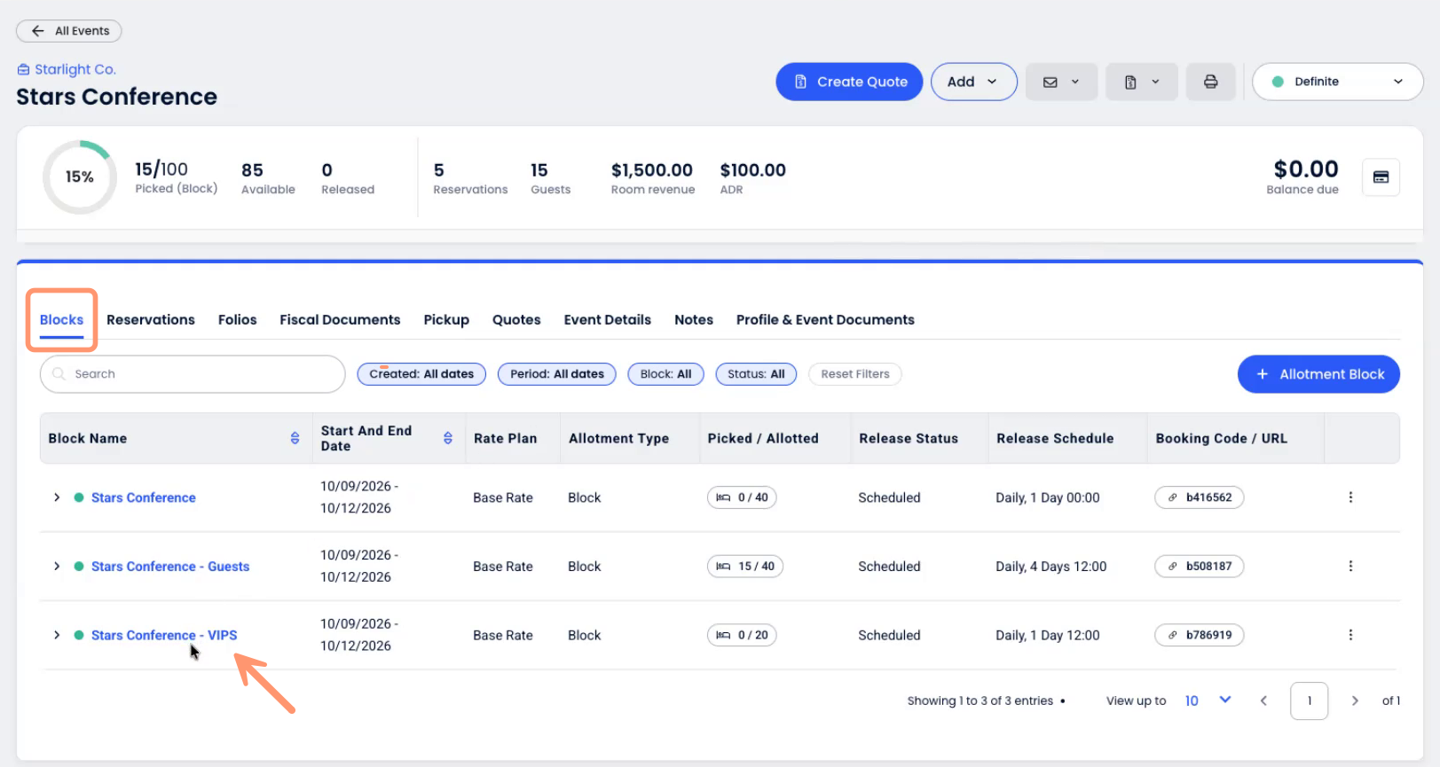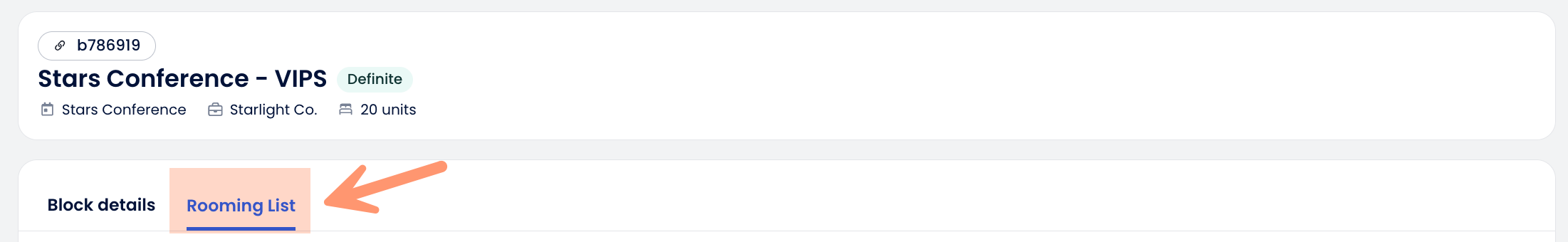 - Open your Event > Blocks tab > Select a specific block > Navigate to the Rooming List sub-tab within your Block details.