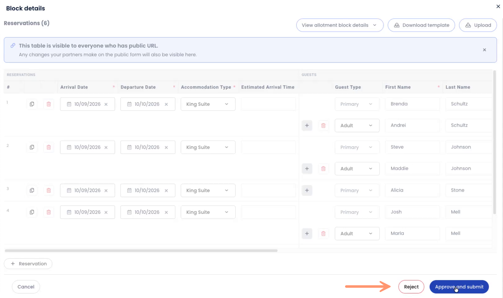 To finalize the process, a property staff member must review the data and click Approve and Submit to create the reservations or Reject the submission if corrections are needed.
