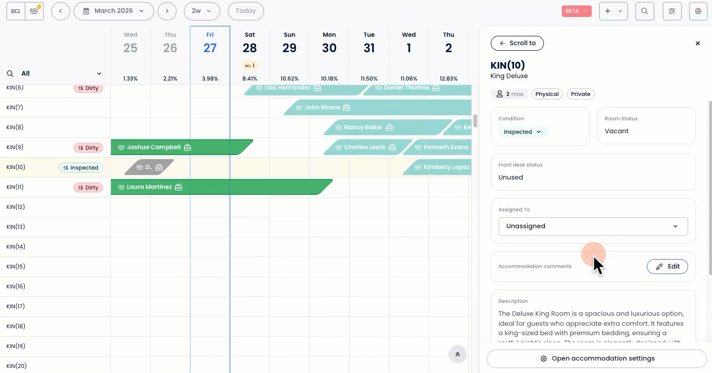 - Scroll-to-Room: In large properties, click the Scroll to button within the drawer to instantly jump the calendar grid to that specific room and highlight it.