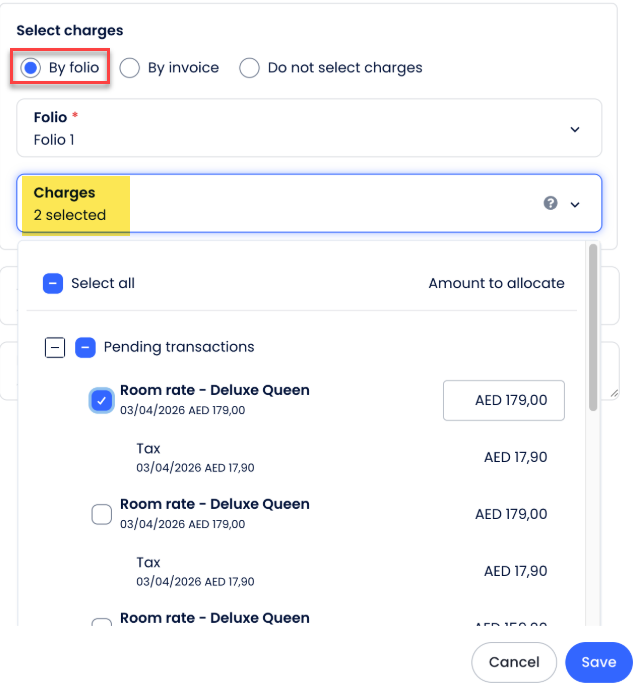 When you use the "By Folio" allocation method, Cloudbeds will only show you transactions that haven't been allocated to a receipt yet. If it’s not on the list, it’s already been covered!