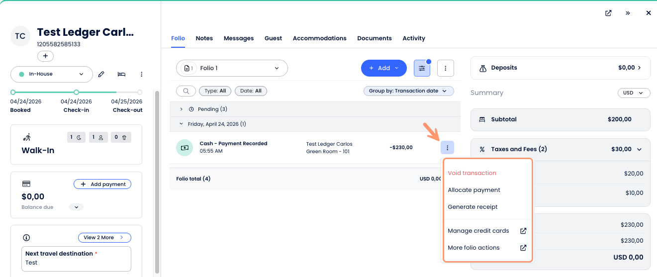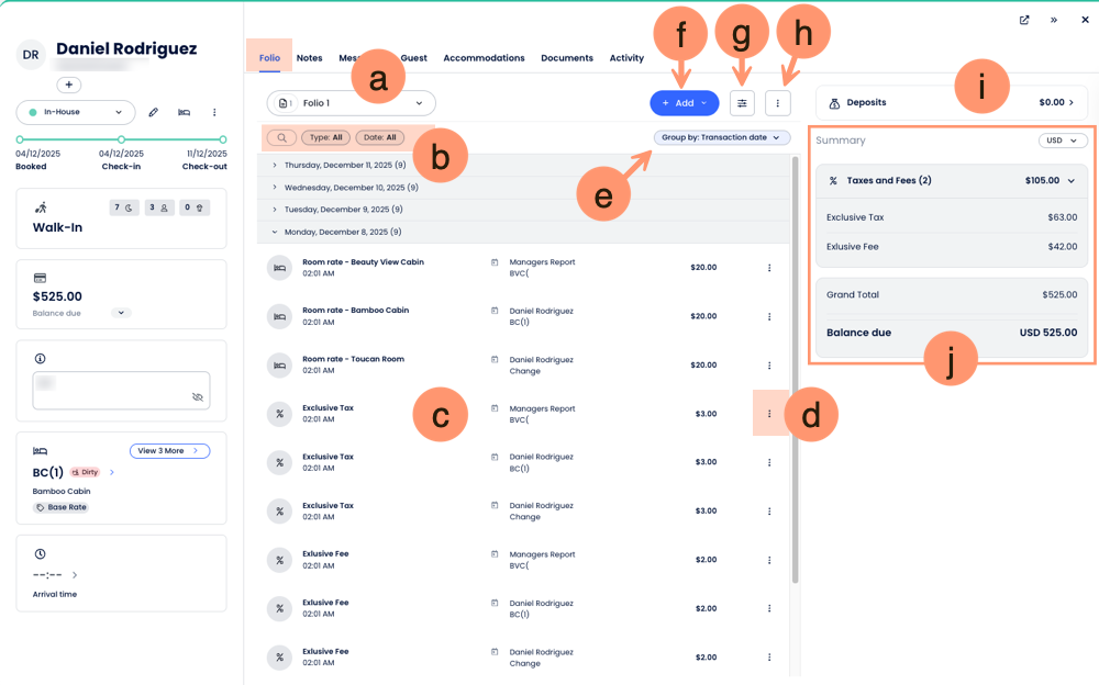 - More Actions: Access tools to create invoices, export data, or email the folio.