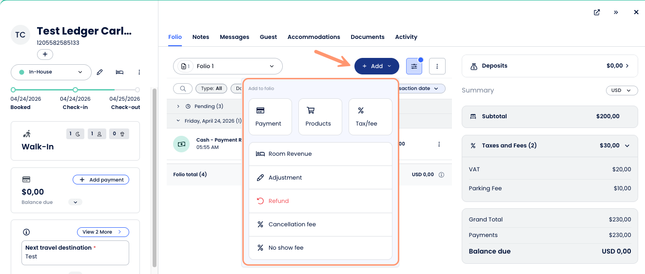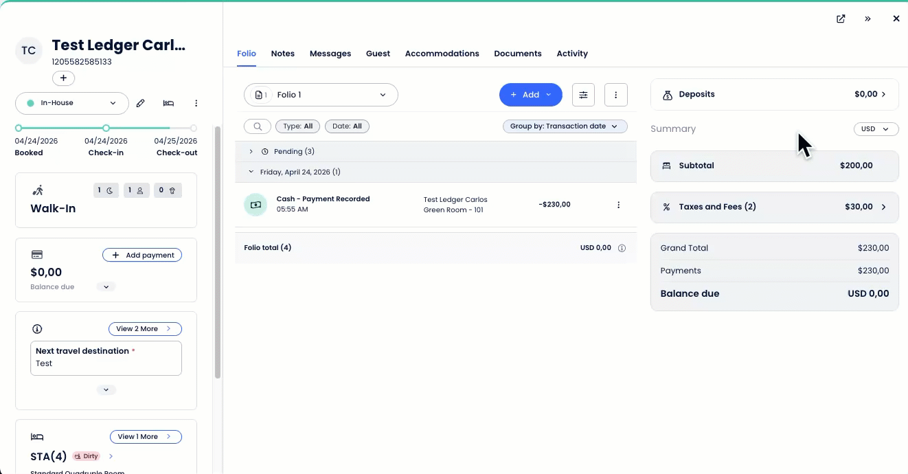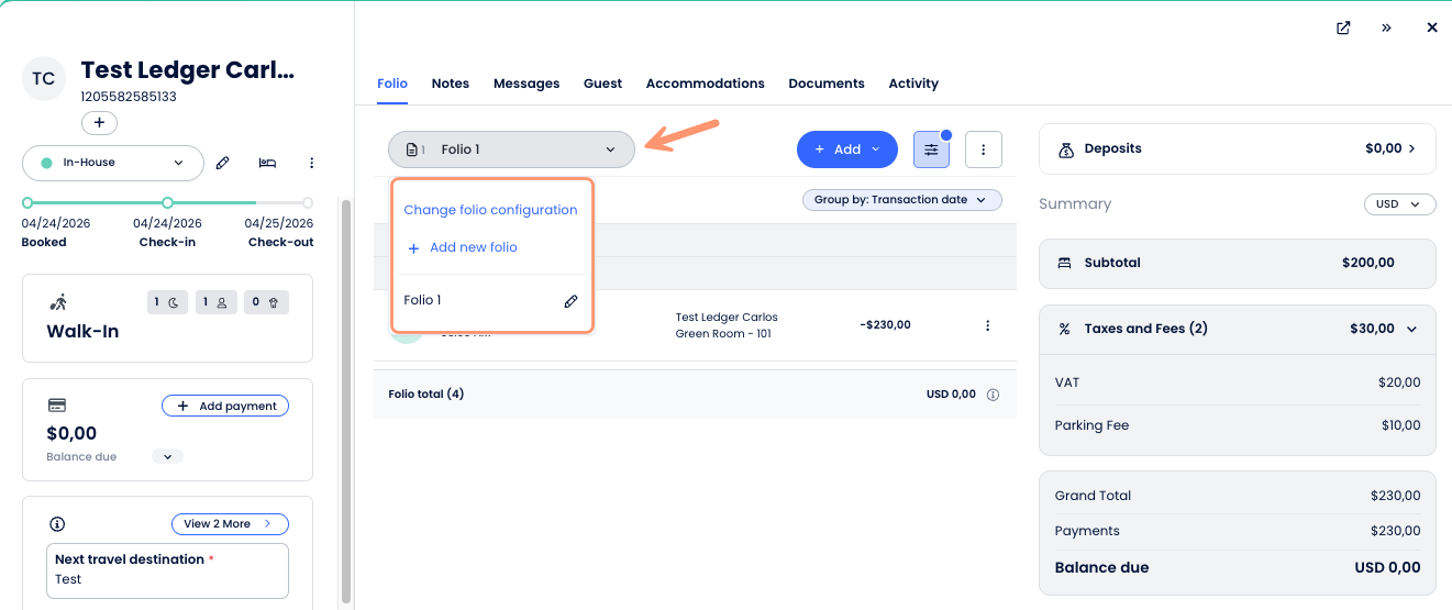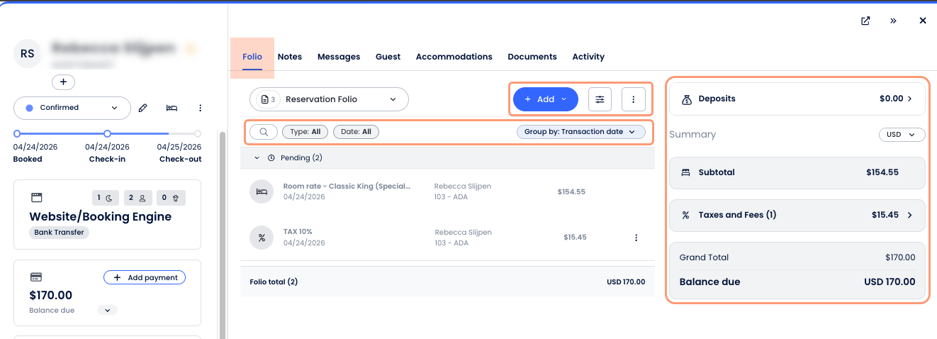 - The new Folio UI includes a single + Add button, a Summary Panel with Grand Total, Payments, and Balance due, as well as a Deposits section and Currency selector (when applicable).
