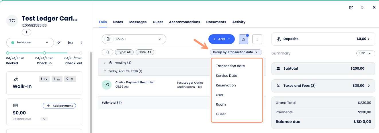 You can also use the Group by dropdown in the folio header to organize transactions by transaction date, service date, user, among others.