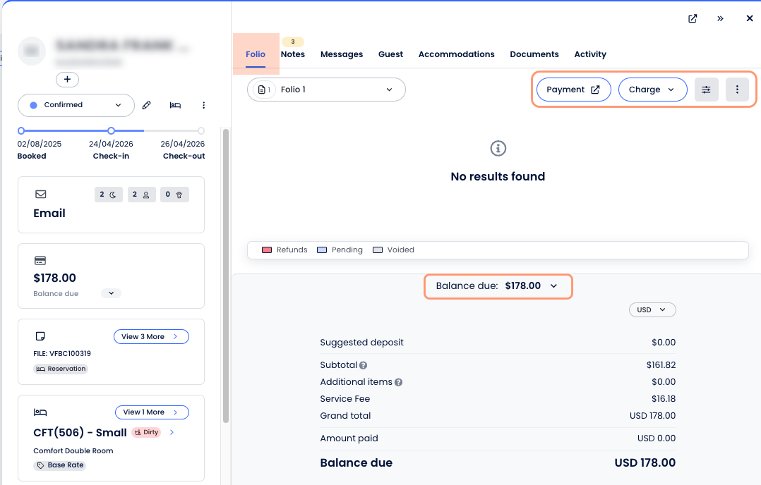- Folio Selector and Settings: Switch between multiple folios assigned to the reservation and manage settings for the selected folio.