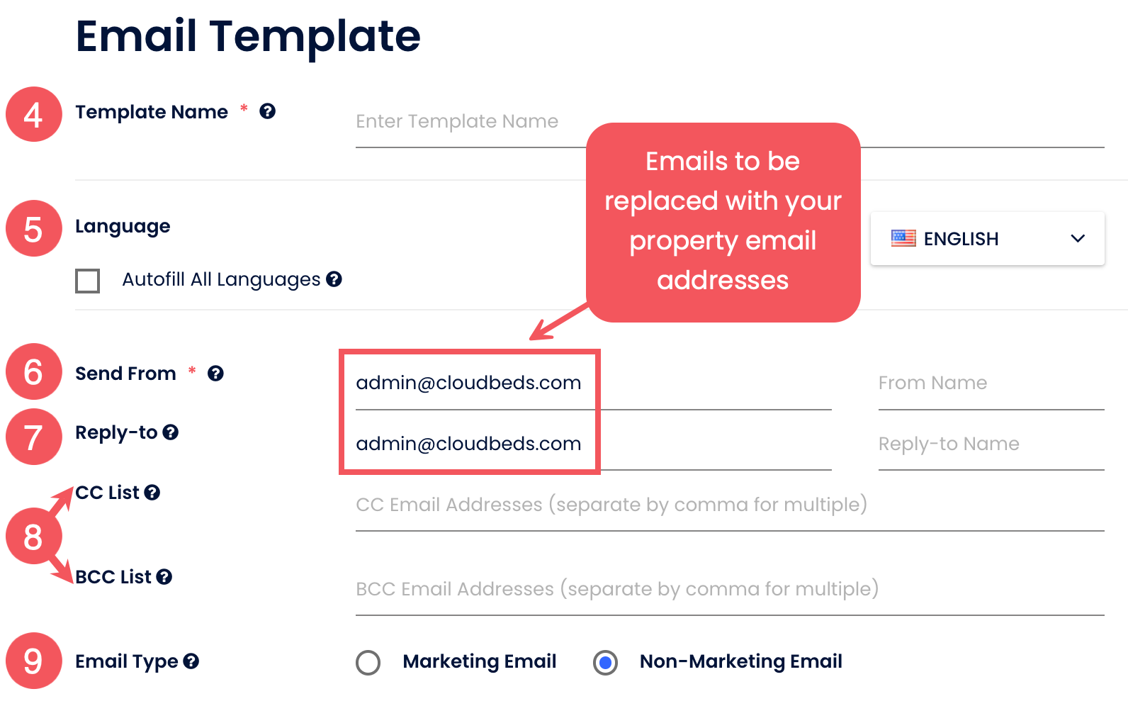- Email Type (Only for properties who enabled GDPR Compliance): If GDPR Compliance is enabled, every Email Template will have a required radio button specifying whether email is marketing related. Templates flagged as marketing emails will only be sent to guests who opt in to marketing materials. Non-marketing emails will be sent to all guests you have ongoing business relations with.
