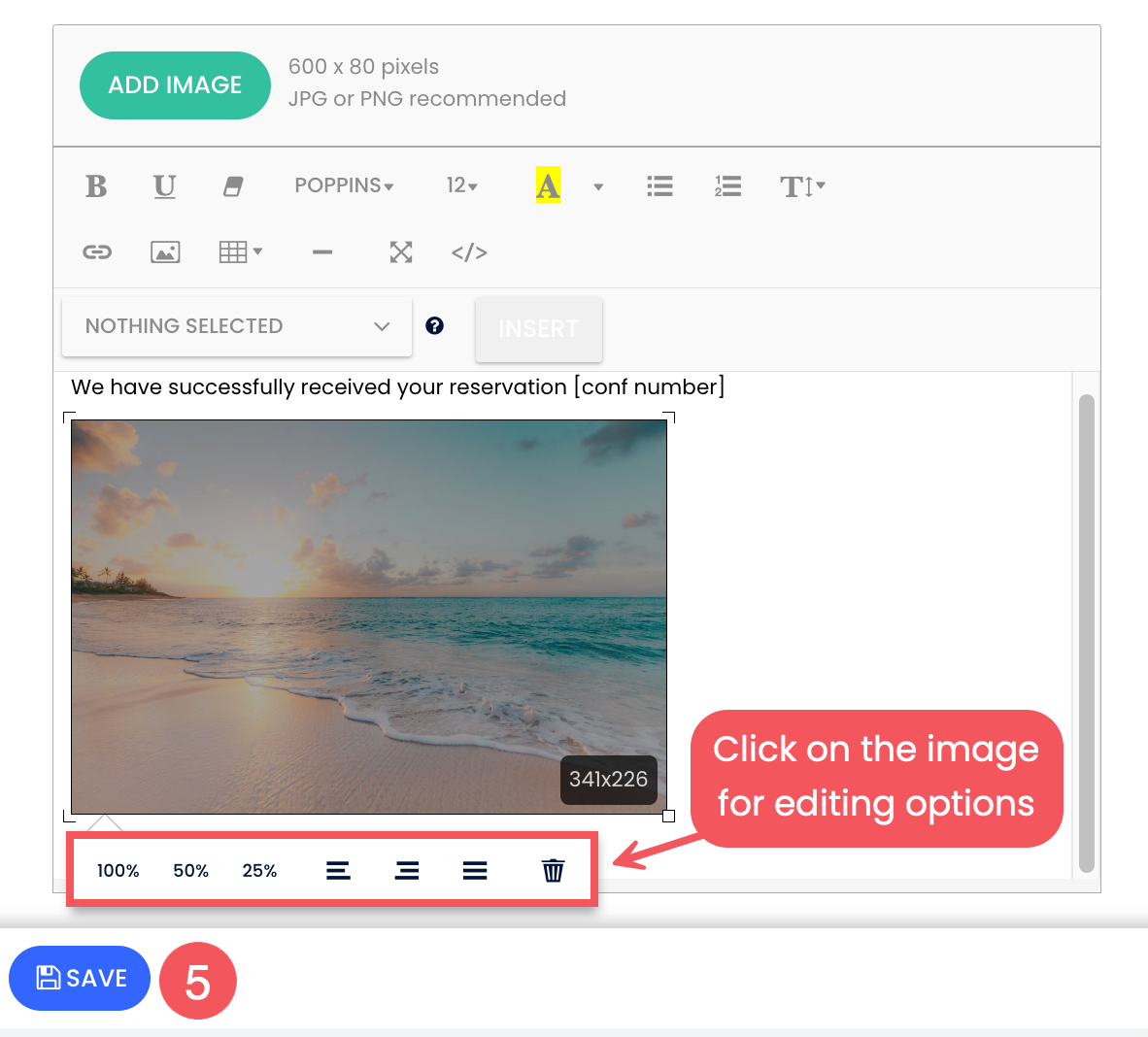 Currently, different email service providers support different types of images. Make sure the method used works properly for all of them when sending images to the guests through email. We suggest using the Image URL option rather than selecting from files on your PC because embedded image display will only work with the following email service providers:
