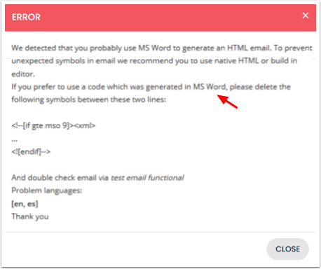 - Reason: This error occurs when the system detects that MS Word has been probably used to create the email, which can cause character incompatibility and show symbols instead of the expected text.