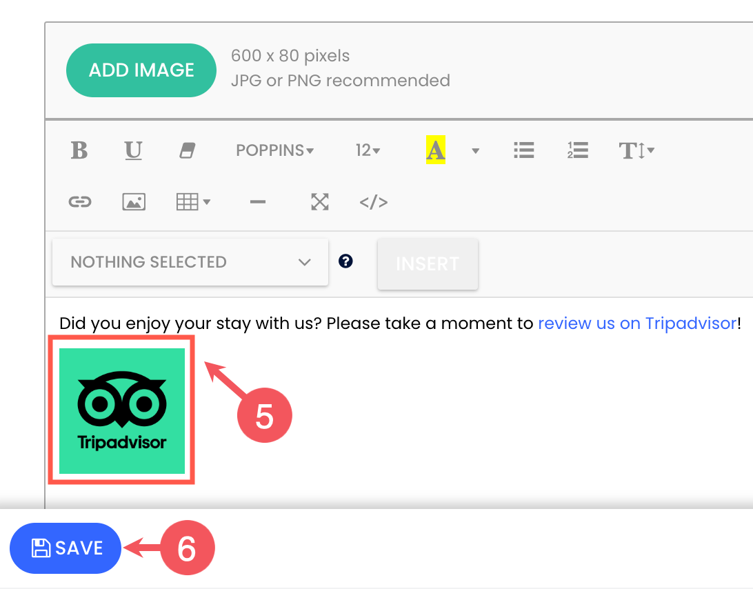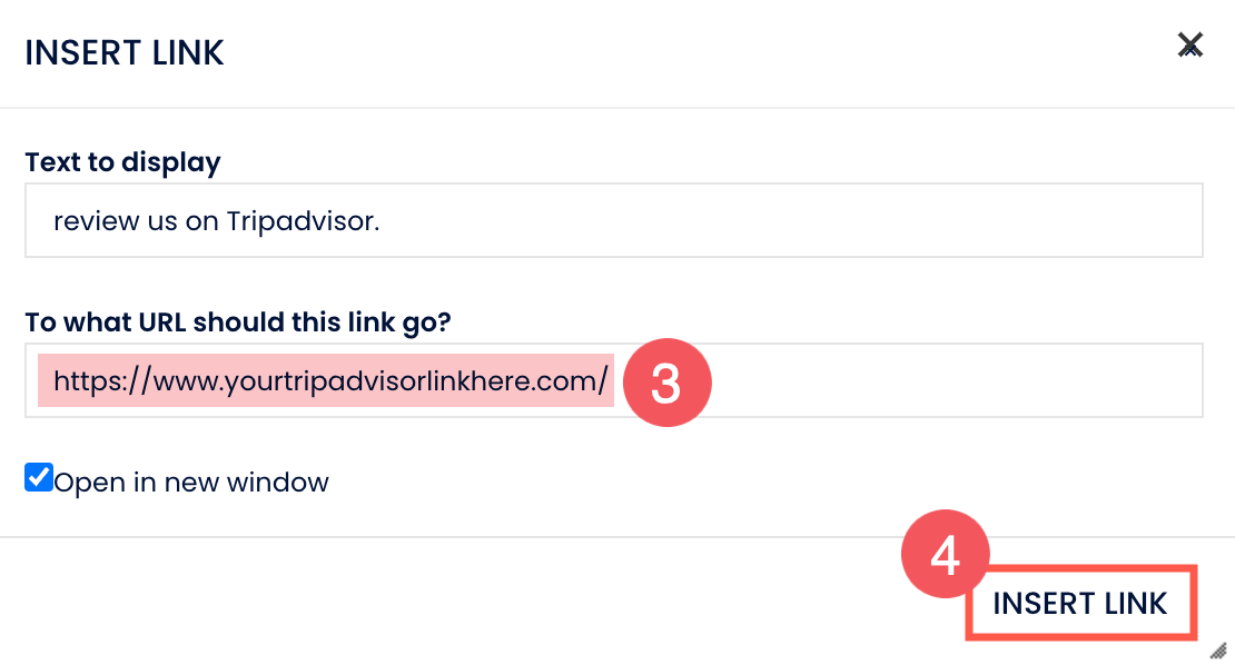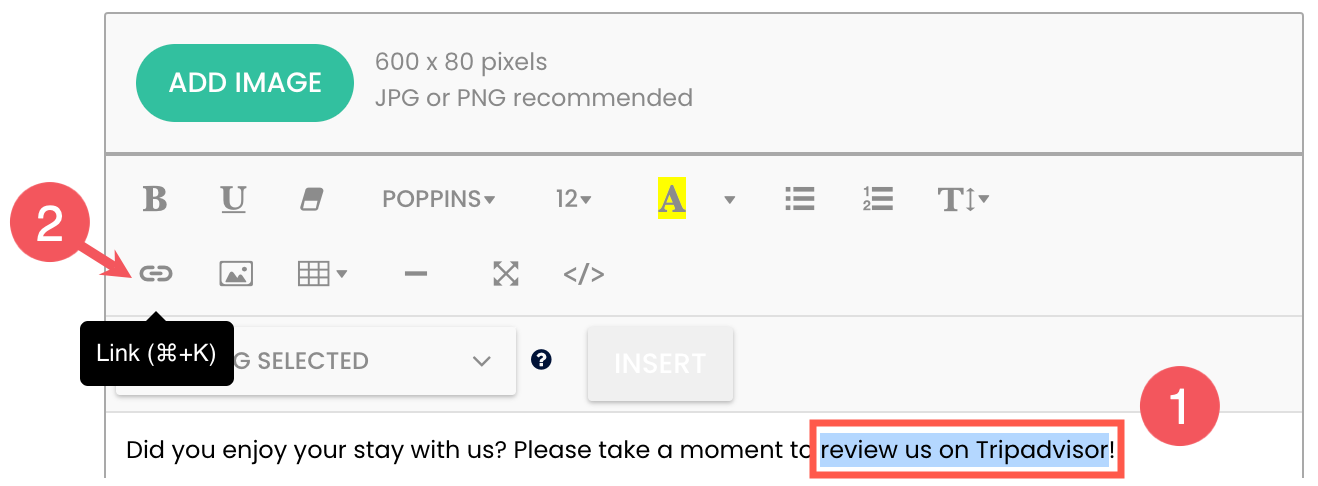 - Follow the steps to Edit your email template to select the text in your template that will take your guests to your guest reviews page (for example: Visit our Tripadvisor page)