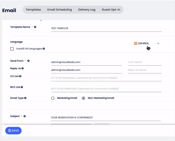 For example, the gif below shows what happens when you try to save a Template in Spanish. If your property's default language is English, then a template in Spanish will also need a subject for the English version.