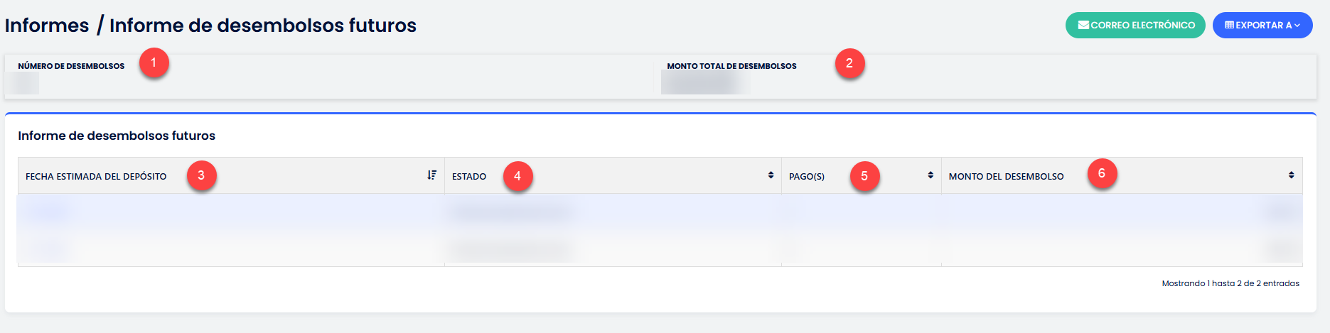 - Estado: Detalla el estado del desembolso