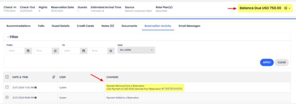 La anulación se registra dentro de la actividad de la reserva, y el saldo pendiente se actualizará en consecuencia: