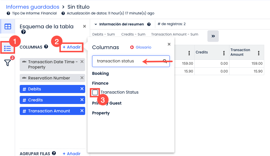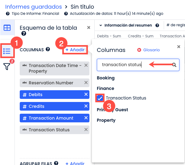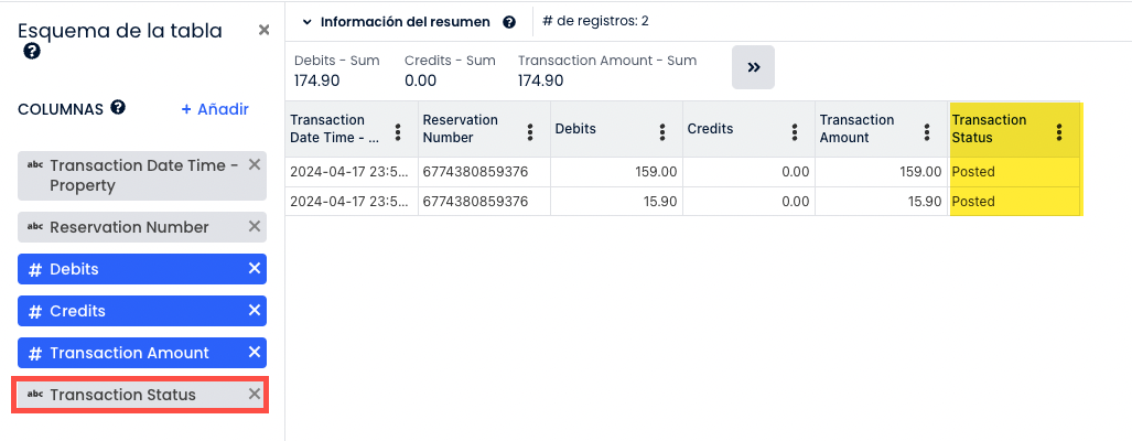Si no quieres incluir el Estado de la transacción al informe, asegúrate de no seleccionar el CDF Estado de la transacción en el Esquema de la tabla.