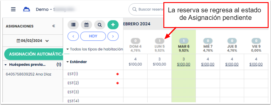 - Esto eliminará la asignación de la reserva y la enviará a la sección de asignación pendiente del Calendario. Ahora puedes asignar esta reserva al nuevo tipo de habitación. Consulta más detalles sobre cómo realizar esta acción aquí.