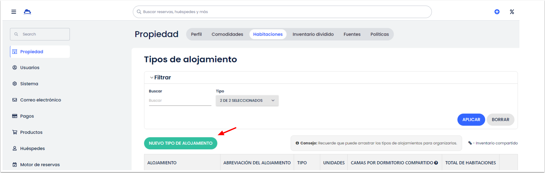 Ve a la sección Propiedad para crear tu nuevo tipo de habitación en el PMS de Cloudbeds y también en todas las OTA a las que tu propiedad esté conectada. Aprende cómo en este artículo.