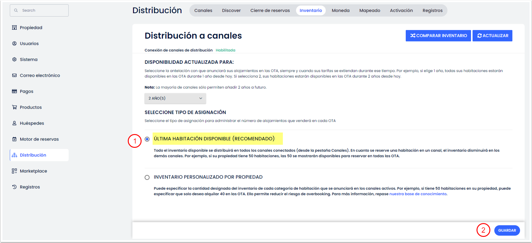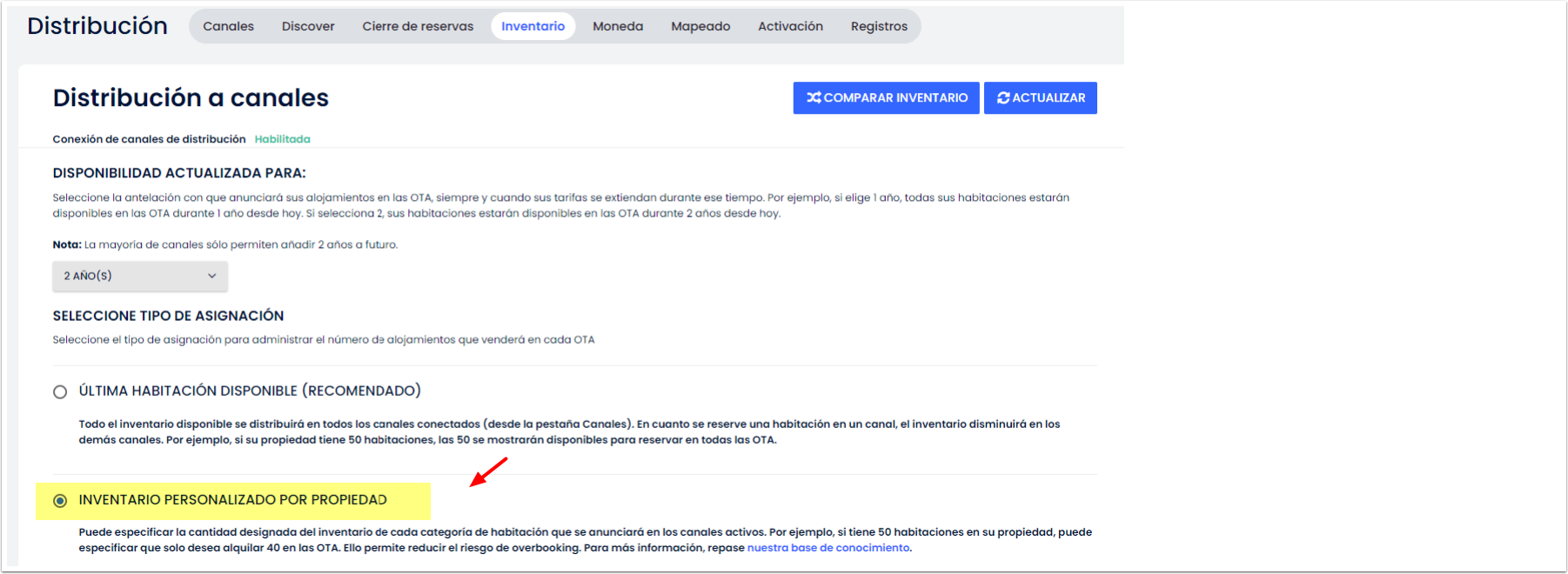 - Vuelve a tu página de inventario de distribución para agregar el inventario nuevamente, de modo que se distribuya correctamente en todas tus OTA conectadas.