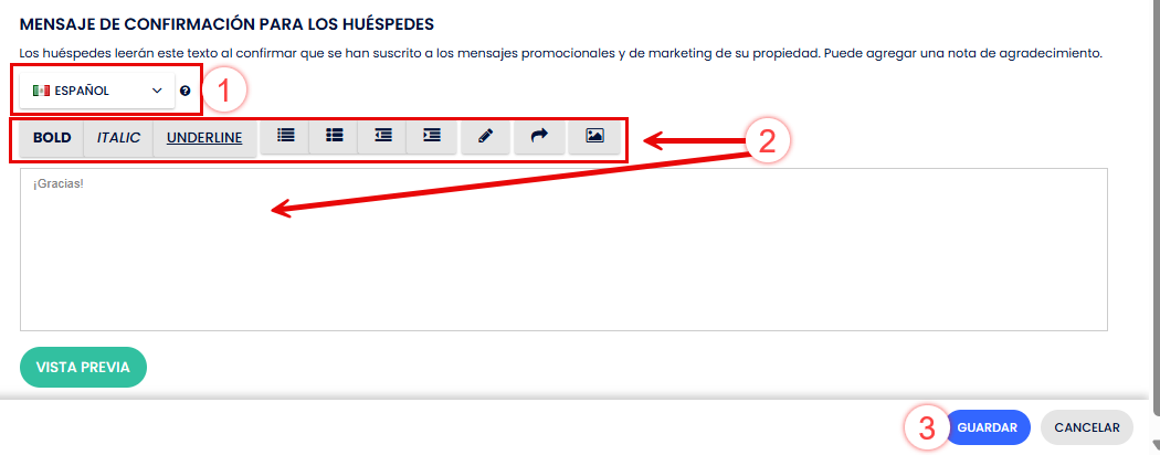 - Mensaje de confirmación para huéspedes: El texto se muestra cuando el huésped confirme que quiere recibir los correos electrónicos de marketing.
