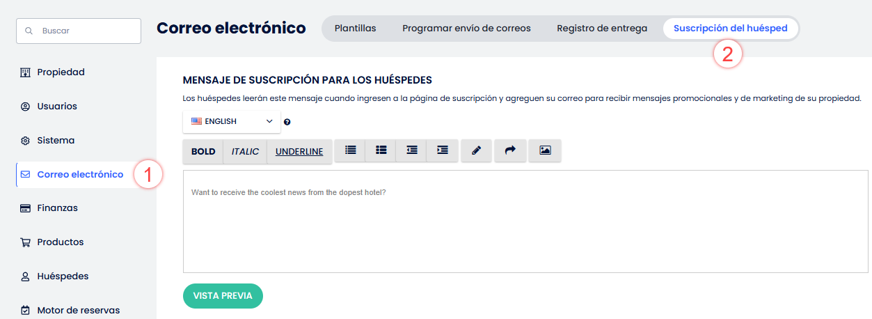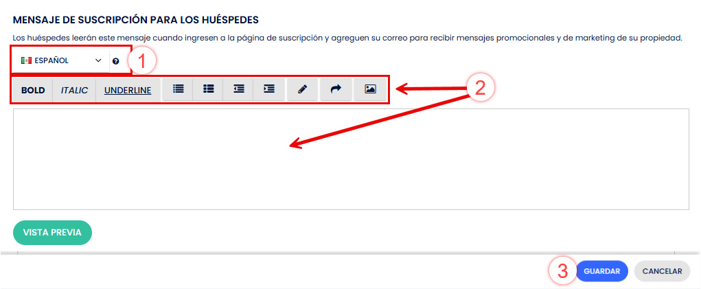 - Escribe el texto de suscripción para tus huéspedes. De ser necesario, usa el editor para aplicar formatos al texto.