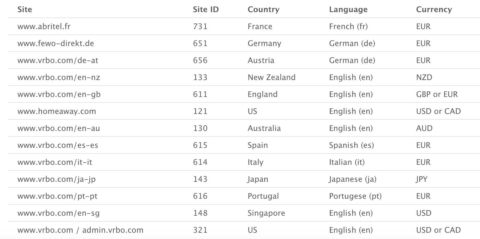 | Vrbo (Singapur) | Inglés (en) | USD |