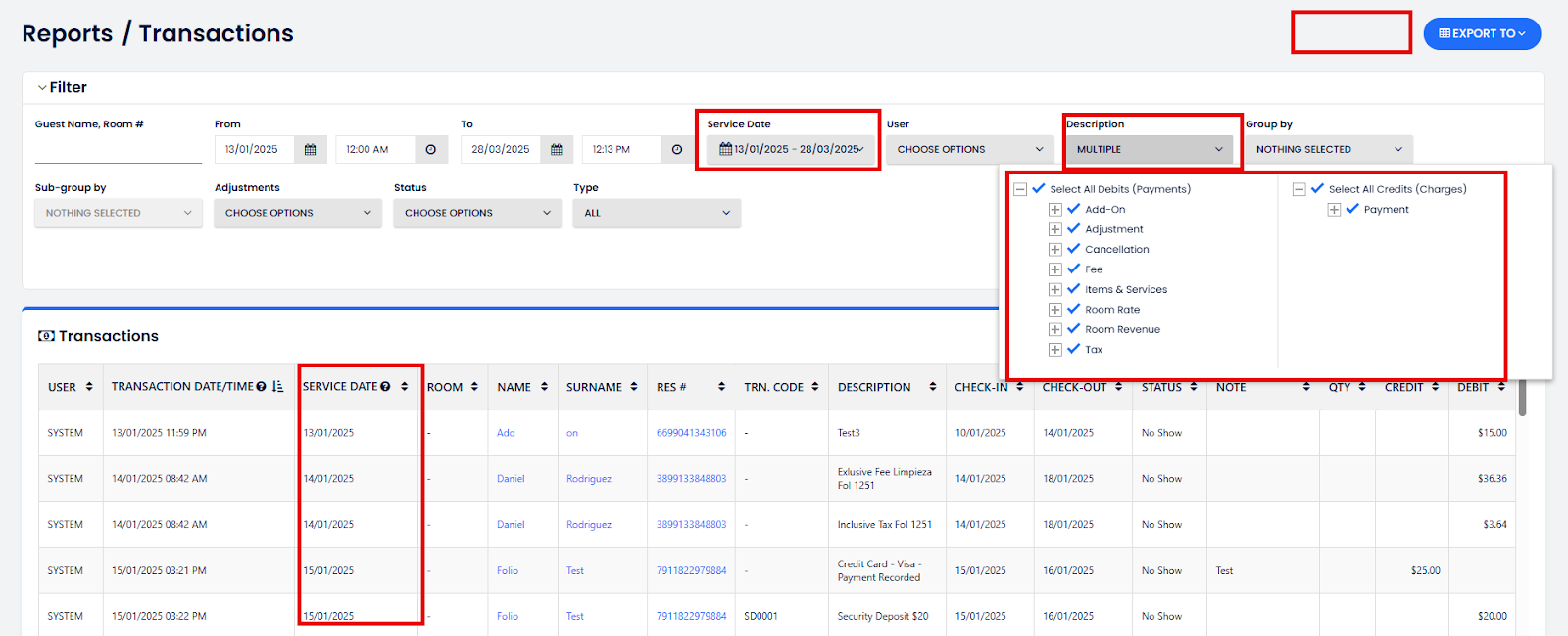 El Informe de Transacciones está ubicado en la sección de Informes Financieros. Algunas transacciones se refieren a ingresos de la propiedad, como cargos de alimentos y bebidas, y cargos de Habitación e Impuestos (Débitos). Otras transacciones se refieren a pagos realizados por el huésped, como pagos con tarjeta de crédito o en efectivo (Créditos).