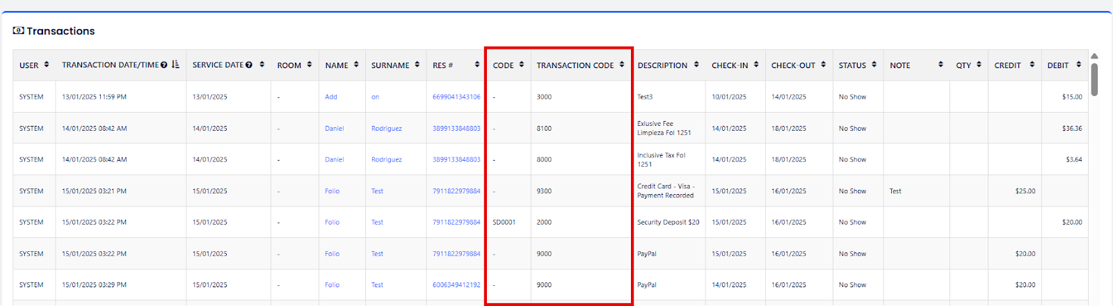 - La columna Código muestra los códigos de transacción definidos por el usuario, y la nueva columna Código de transacción coincide con las definiciones USALI.