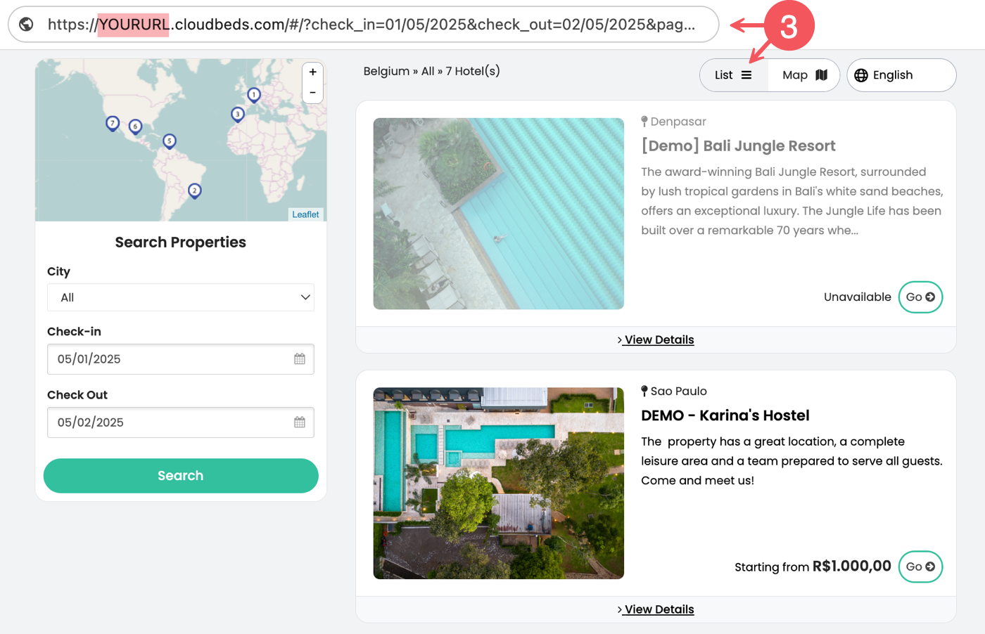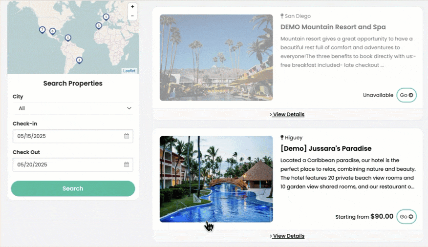 De forma predeterminada, al hacer clic en el botón IR se abrirá la página del Motor de Reservas de la propiedad seleccionada.