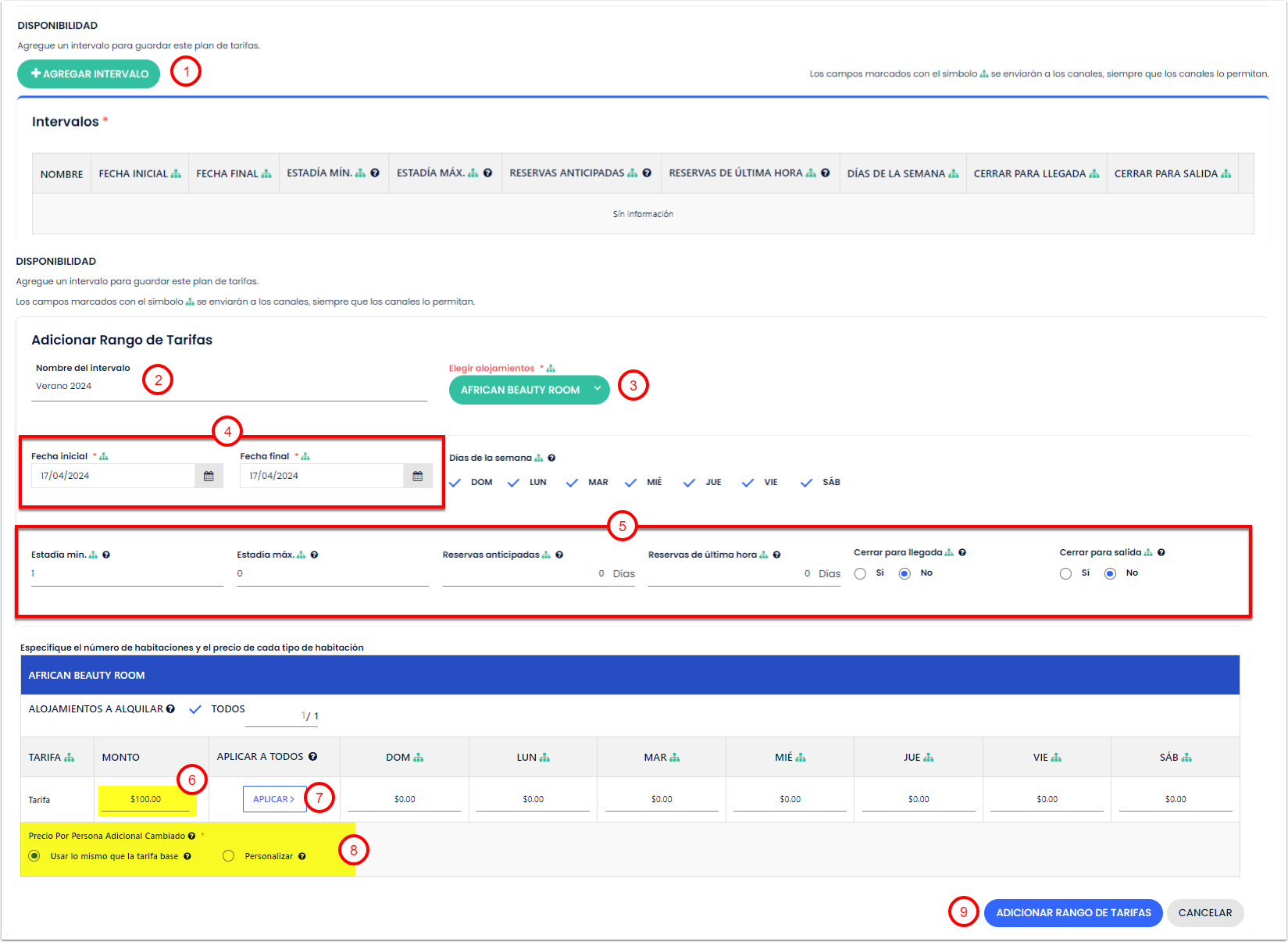 - Continúa a la sección Disponibilidad y haz clic en + Añadir intervalo.