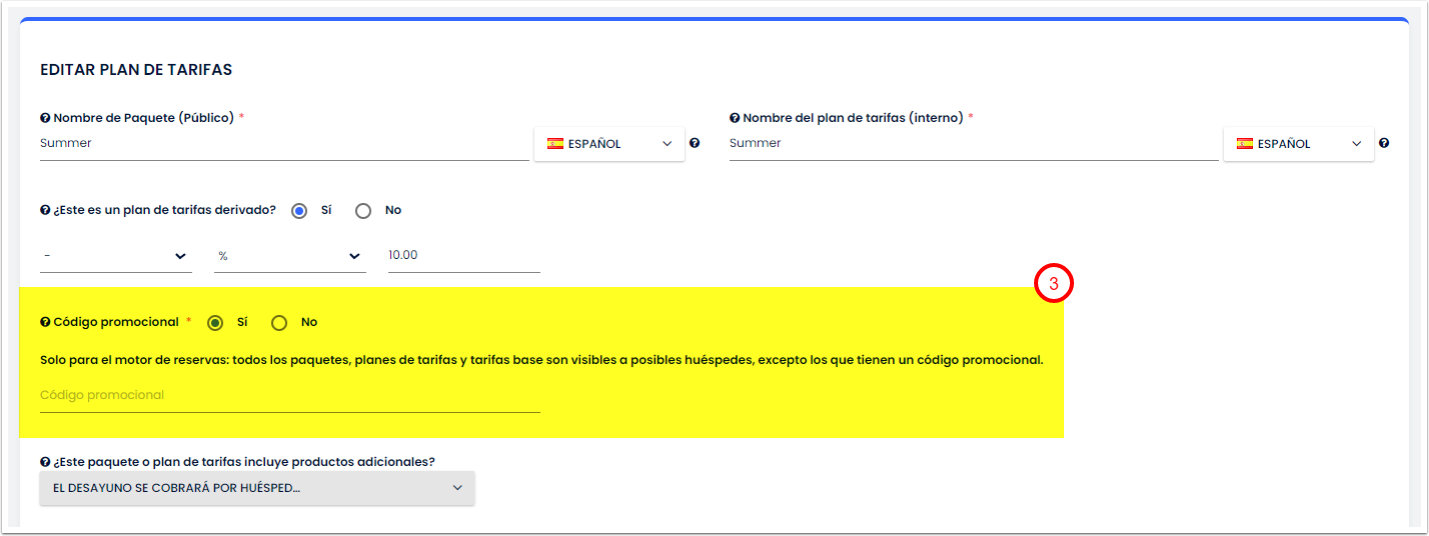 Recuerda que puedes agregar políticas, productos y servicios adicionales e imágenes a tu plan de tarifas en la sección Código promocional, pero no es obligatorio.
