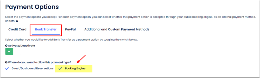 Asegúrate de seleccionar Motor de reservas de Cloudbeds al configurar la Transferencia bancaria como opción; de lo contrario, se ocultará en la página de tu motor de reservas: