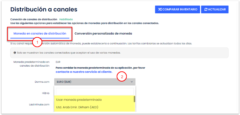 Por este motivo, en la página Moneda, encontrarás dos pestañas para asegurarte que las monedas coincidan: Moneda en canales de distribución (1) y Conversión personalizada de moneda (2).