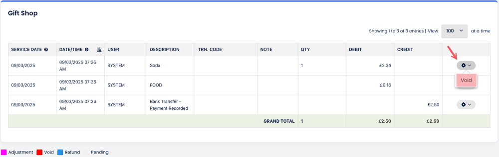 Si necesitas anular el cargo ajustado, haz clic en el ícono de engranaje como se muestra a continuación, y haz clic en Anular:
