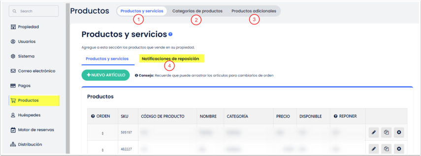- Productos y servicios. Registra los productos y servicios disponibles en tu propiedad para llevar el control del inventario y crear su número SKU, código y precio.