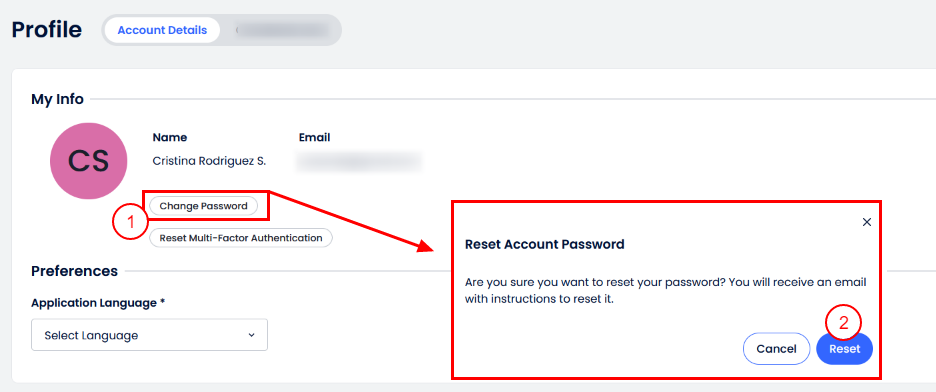 - El sistema mostrará una ventana emergente con instrucciones para cambiar tu contraseña mediante un correo que se enviará a la dirección registrada. Haz clic en Restablecer para recibir el correo de restablecimiento de contraseña.